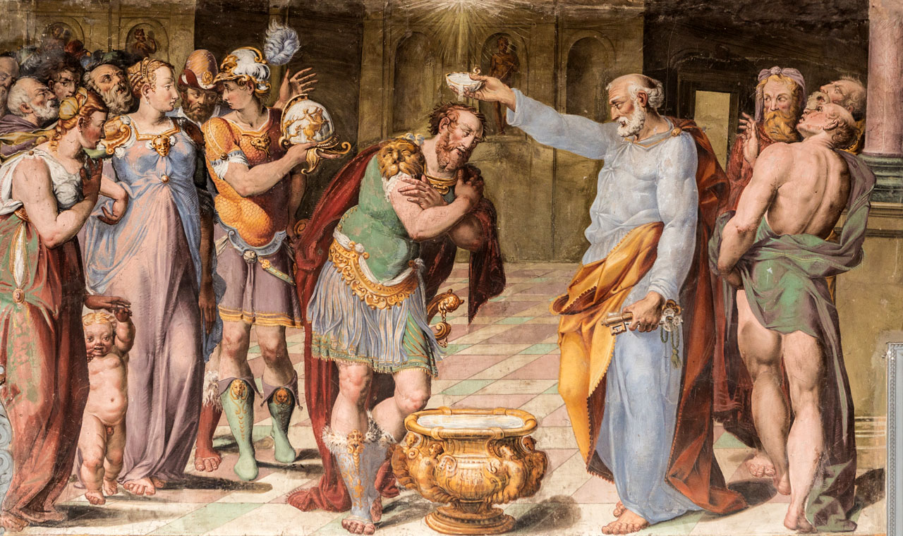 L’antica Basilica di San Pietro, sorta sul Colle Caprarius (detto anche Calvario) probabilmente in prossimità di un’area cimiteriale, è menzionata da Gregorio Magno nel VI secolo come prima sepoltura di Sant’Ercolano, il martire che difese la città di Perugia dall’attacco del re dei Goti Totila.